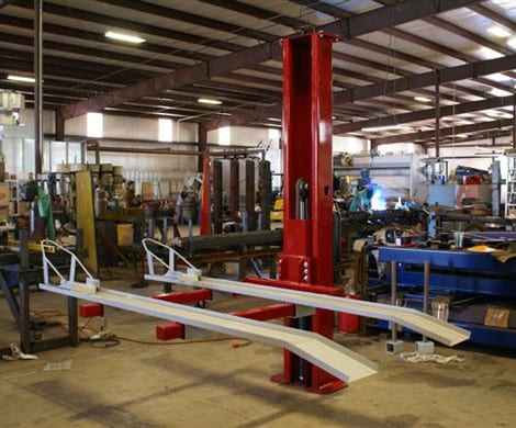 The post is arranged to the side of the bikes. The SP2200 has a 2,200 pound capacity and is proudly built in Texas. We can customize the platform size, lifting capacity or lifting height to meet your requirements at an additional cost.