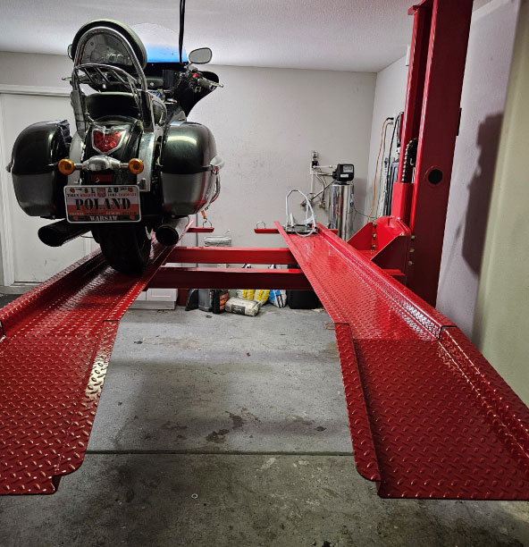 Maximize garage space with the American-made SP2500 Double Motorcycle Parking Lift. Built in Texas with a 2,200 lb weight capacity, this side-post lift offers durable, space-saving storage for up to two motorcycles. Fully customizable in platform size, lifting height and capacity, it provides premium versatility for any garage or showroom. Optional upgrades include a 90° power motor bracket, 220V motor, and multiple premium powder coat color finishes. A reliable, high-strength solution for safe motorcycle parking and elevated storage.